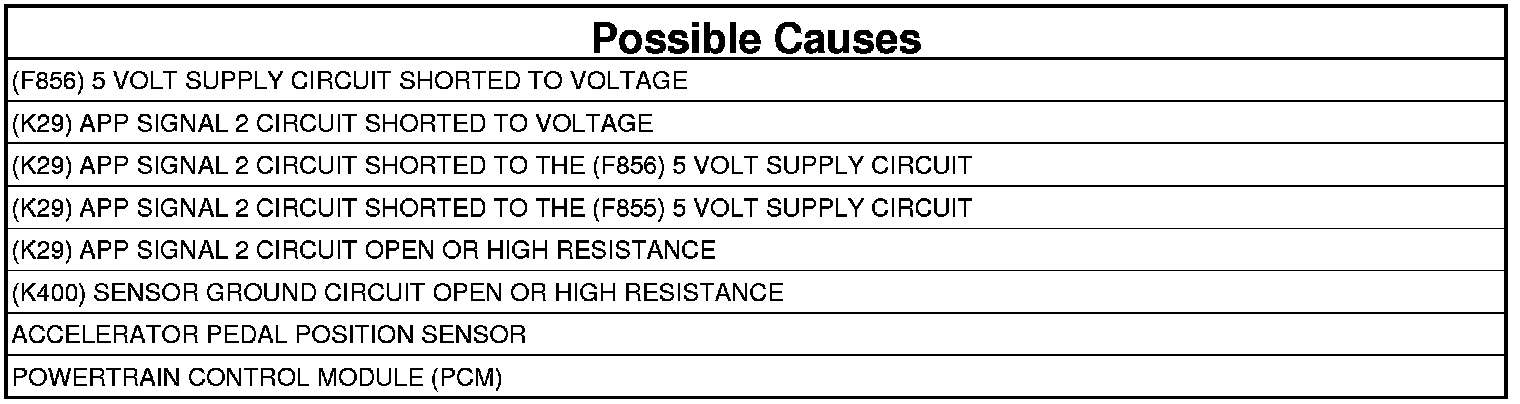 - Repair the (K29) APP Signal 2 circuit for a short to the (F856) 5 Volt Supply circuit.