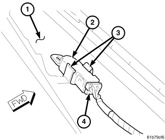 1. Position the infrared sensor (3) onto the back of the overhead console (1). Align the slot on the front of the sensor with the tabs (4) on the console.