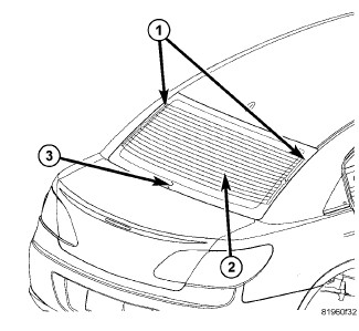 The rear window defogger system, also known as electric backlight (EBL), consists of two vertical bus bars (1) and a series of grid lines (2) fired onto the inside surface of the rear window (3).
