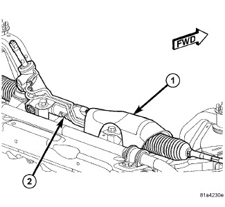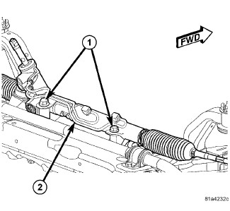 13. Install the two bolts (1) securing the steering gear (2) to the crossmember. Tighten the steering gear mounting bolts to 100 Nm (74 ft. lbs.).