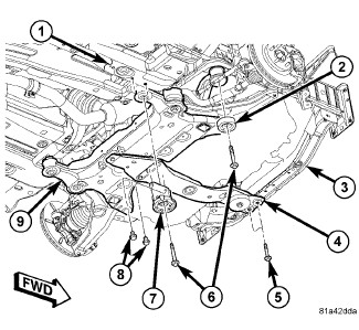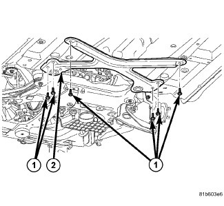 8. Install the four mounting bolts (6) securing the front crossmember (1) to the body. Tighten the crossmember mounting bolts to 135 Nm (100 ft. lbs.).