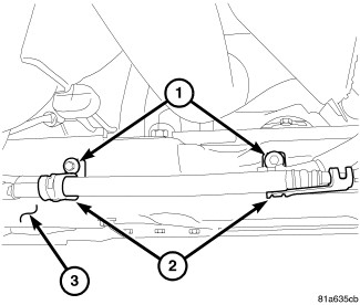4. Install the screws (1) securing the stabilizer bushing retainers (3) to the crossmember. Tighten all four stabilizer bar cushion retainer screws to 60 Nm (44 ft. lbs.).