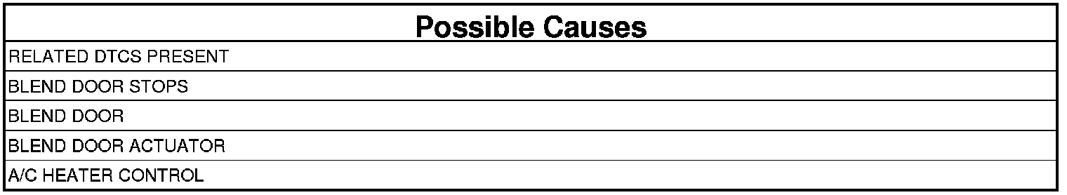 After the initial installation of the A/C Heater Control, the controller is calibrated to each individual blend/mode door actuator. These calibrations are stored as in the number of pulses it takes to move the door from one stop to another. The A/C Heater Control drives the Door Actuators by the use of Door Driver circuit and a Common Door Driver circuit and monitors all door actuator pulses to detect door movement in both directions. Most of the door actuators share a common door driver circuit but each door actuator has its own unique driver circuit. Due to shared circuitry, similar Diagnostic trouble Codes (DTCs) can set at the same time for multiple actuators depending upon the type of circuit malfunction, its location, and the direction the actuator is moving when the malfunction is present.