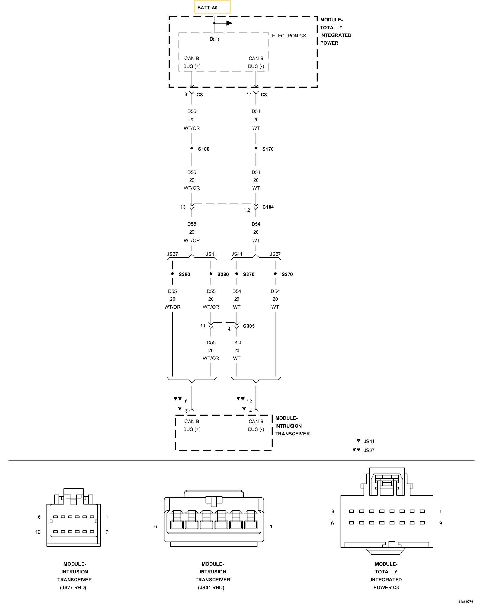1. Measure the resistance of the (D54) CAN B Bus (-) circuit between the TIPM C3 connector and the Intrusion Transceiver Module connector.