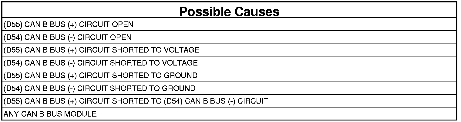 - Disconnect each CAN B Bus module one at a time while observing the voltage to determine if the short is caused by an internal short within a module. Replace the module,, that when disconnected eliminates the short to voltage. If the short condition is still present with all CAN B Bus modules disconnected use the Wiring Diagrams to help isolate and repair the (D55) CAN B Bus (+) circuit for a short to voltage.