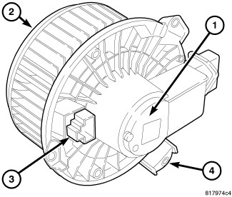 The blower motor is a 12-volt, direct current (DC) motor mounted within a plastic housing with an integral wire harness connector (3) and three mounting tabs (4). The squirrel cage-type blower wheel is secured to the blower motor shaft and is positioned within the air inlet housing on the passenger side of the HVAC housing.