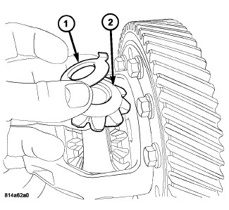 4. Install pinion gears (2) and thrust washers (1) 180° apart.