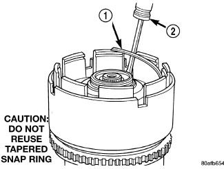 12. Place the UD spring retainer (1) and snap ring (2) into position.