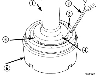 13. Using Compressor 5059-A (6) and an arbor press (1), Install the UD spring retainer and snap ring (3) Compress just enough to install snap ring (3).