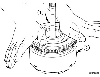 6. Install the input hub/shaft assy. (rotate to align splines) (1) to the OD/Reverse piston/clutch retainer assy. (2).
