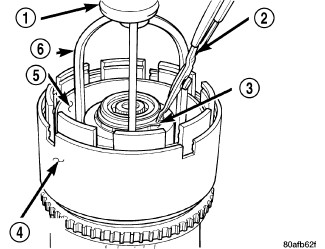 4. Using an arbor press (1)and Disk 6057 (4), install OD/Reverse piston (5) return spring (6) and snap ring (3).