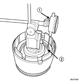 23. Using moderate pressure, press down and hold (near indicator) the UD clutch pack (2) with screwdriver or suitable tool and zero dial indicator. When releasing pressure on clutch pack, indicator reading should advance 0.005-0.010.