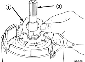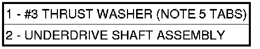 47. Install the #3 thrust washer (1) to the underdrive shaft assembly (2). Be sure five tabs are seated properly.