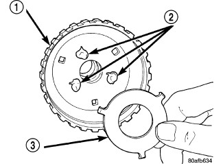 48. Install the number three thrust plate (3) (note 3 tabs) to the bottom of the overdrive shaft assembly (1). Retain with petrolatum or transmission assembly gel (2).