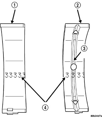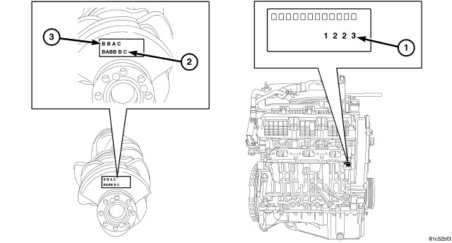 This example shows how to determine the bearing class needed for each crankshaft main journal, assuming that a new crankshaft is being installed in a new or existing engine block. If the code 'B' 'B' 'A' 'C' is stamped on the #9 counterweight of the crankshaft (3), and the code '1' '2' '2' '3' is stamped on the side of the engine block (1), then main #1 would require Class 4 bearings, main #2 would require Class 3 bearings, main #3 would require Class 2 bearings, and main #4 would require Class 3 bearings.