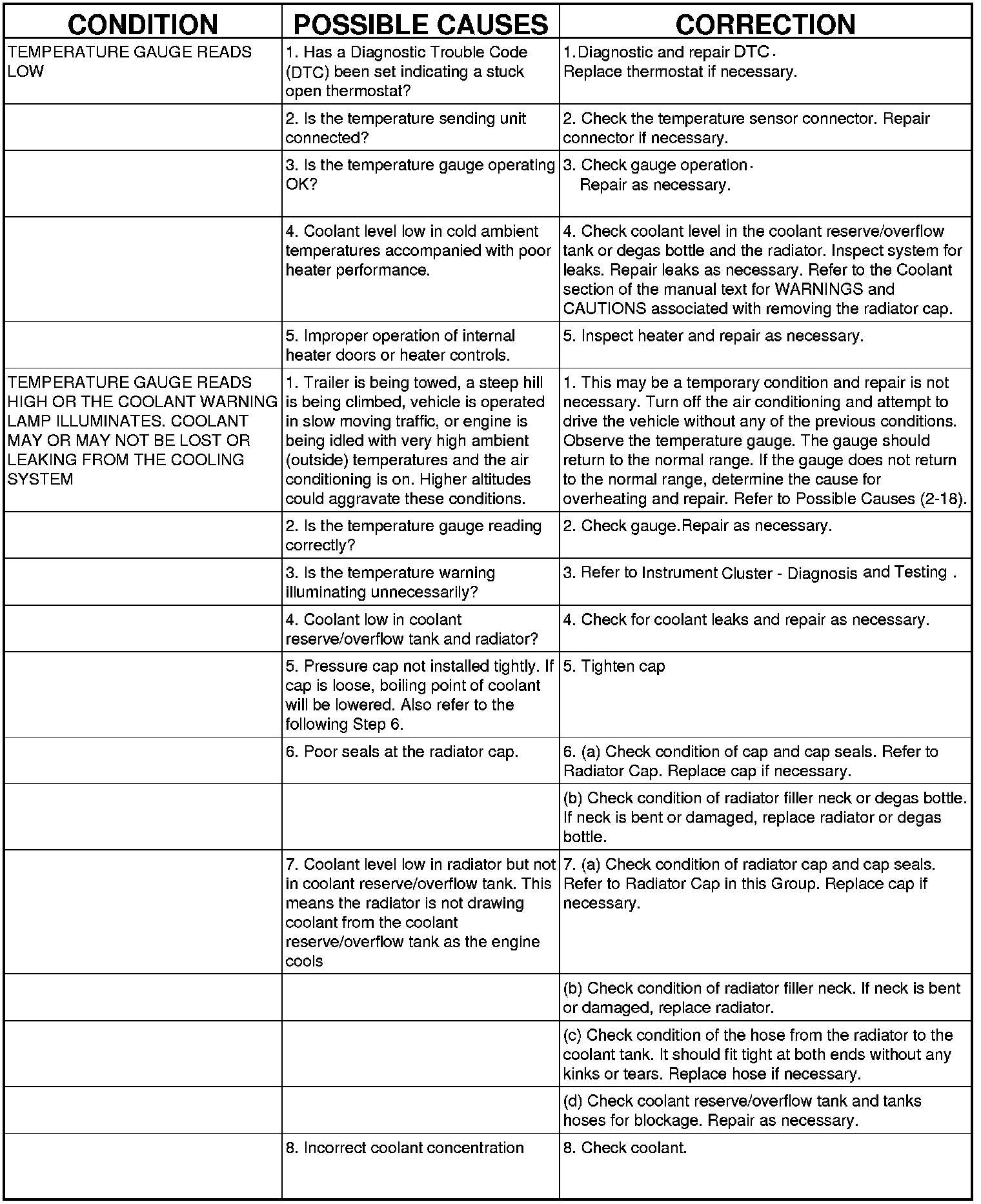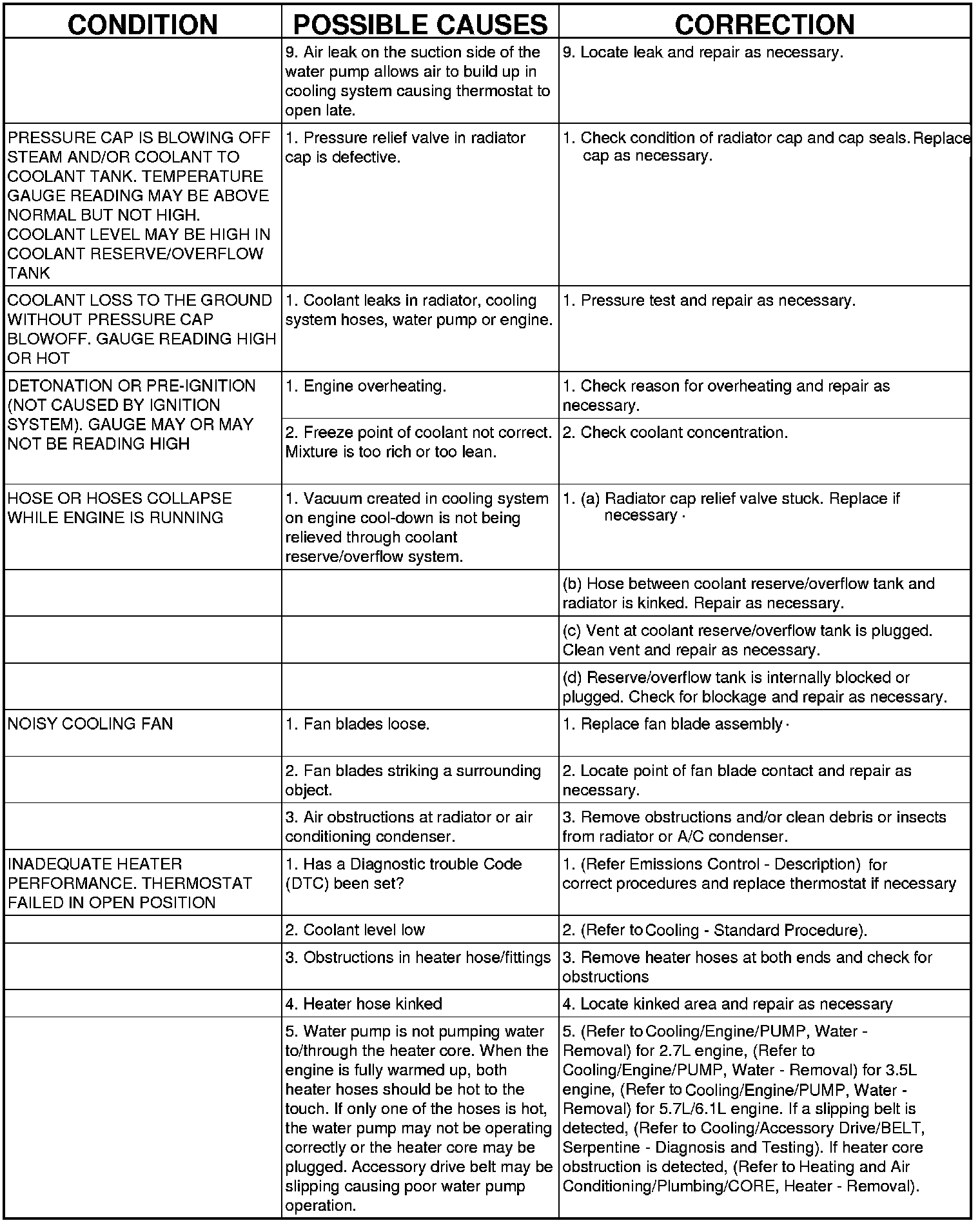NOTE: If investigation reveals none of the previous items as a cause for an engine overheating complaint, refer to COOLING SYSTEM DIAGNOSIS CHART BELOW.