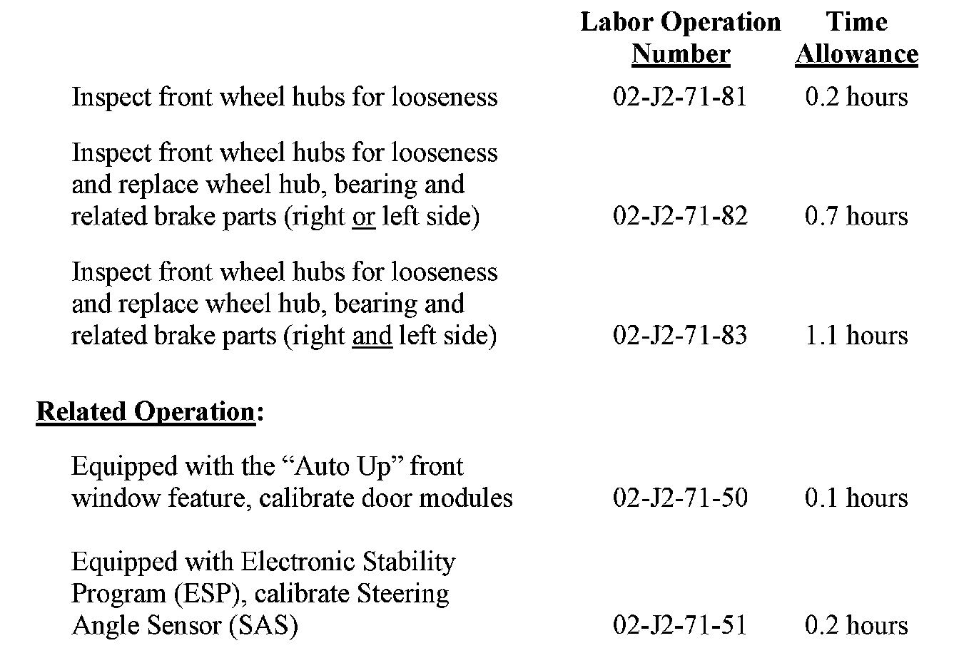 Use one of the labor operation numbers and time allowances shown.