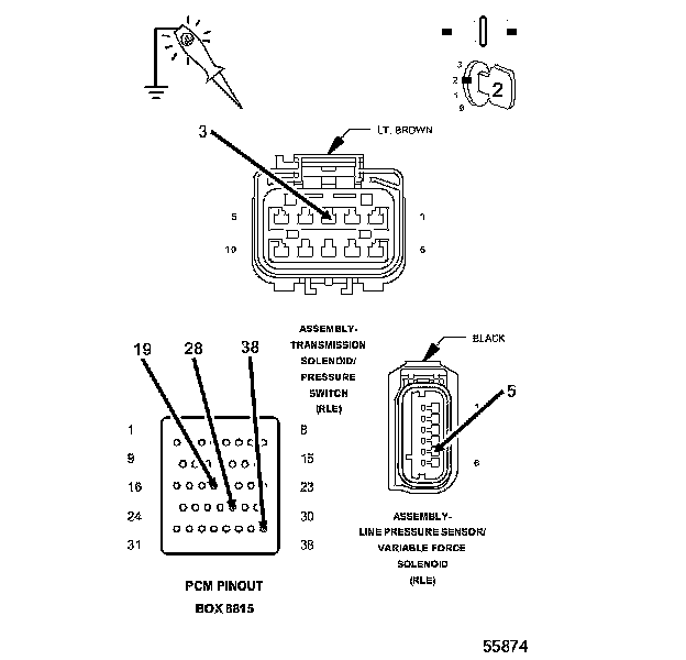 4. Using a 12-volt test light connected to ground, check the (T16) Transmission Control Output circuits.