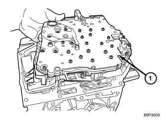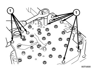 58. Install seven (7) valve body-to-case bolts (1) and torque to 12 Nm (105 in. lbs.).