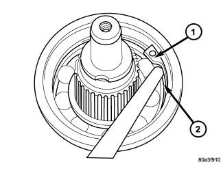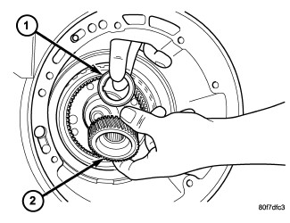36. Install the #7 needle bearing (1) to the rear sun gear (2). The number 7 needle bearing has three antireversal tabs and is common with the number 5 and number 2 position. The orientation should allow the bearing to seat flat against the rear sun gear. A small amount of petrolatum can be used to hold the bearing to the rear sun gear.