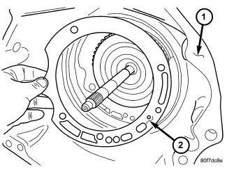 43. Remove the oil pump o-ring (2) and install oil pump and gasket to transmission. Use screw-in dowels or phillips-head screwdrivers to align pump to case. Be sure to reinstall O-ring on oil pump after selecting the proper No. 4 thrust plate.