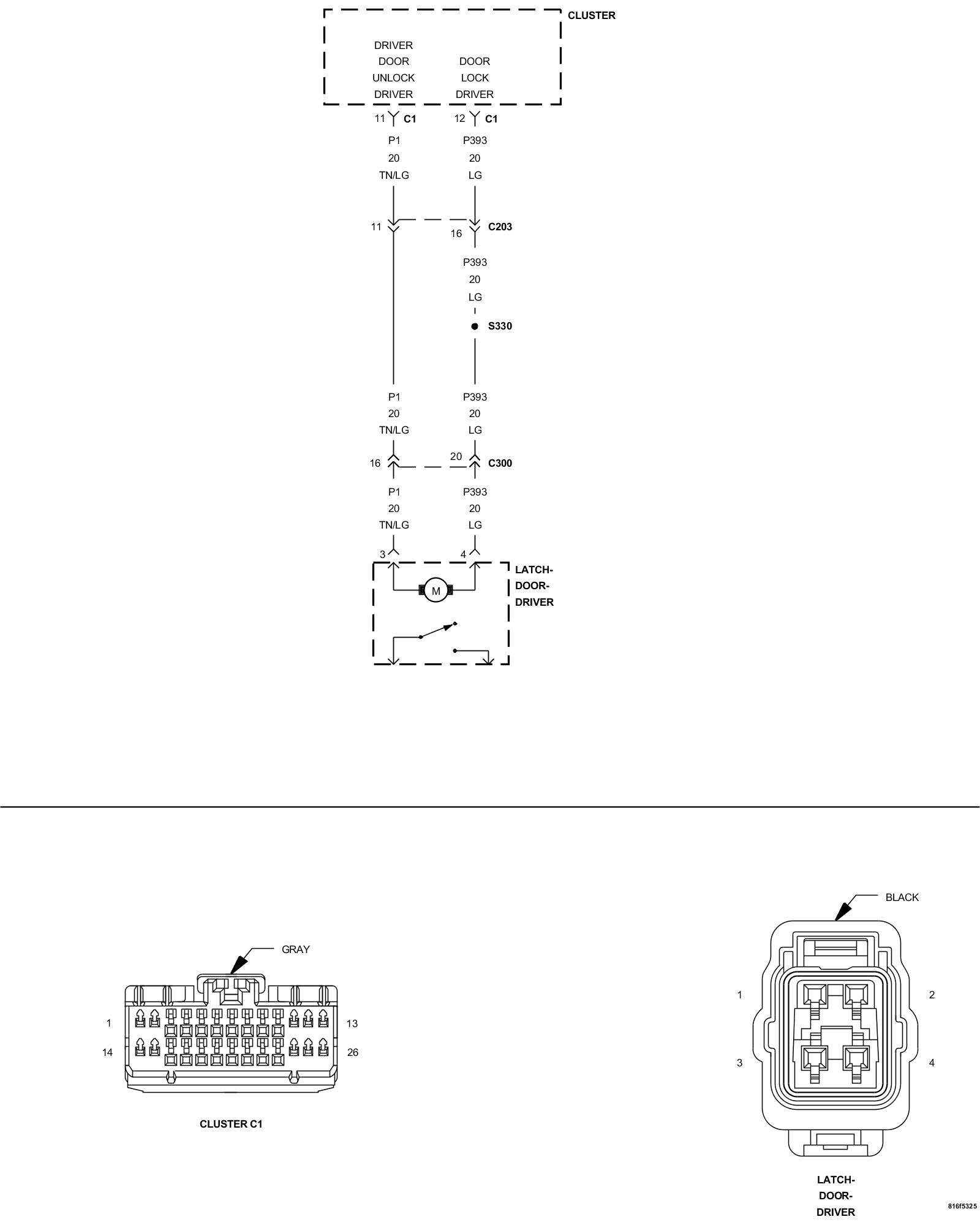 1. Measure the resistance of the (P393) Door Lock Driver circuit between the Cluster C1 connector and the Driver Door Latch connector.