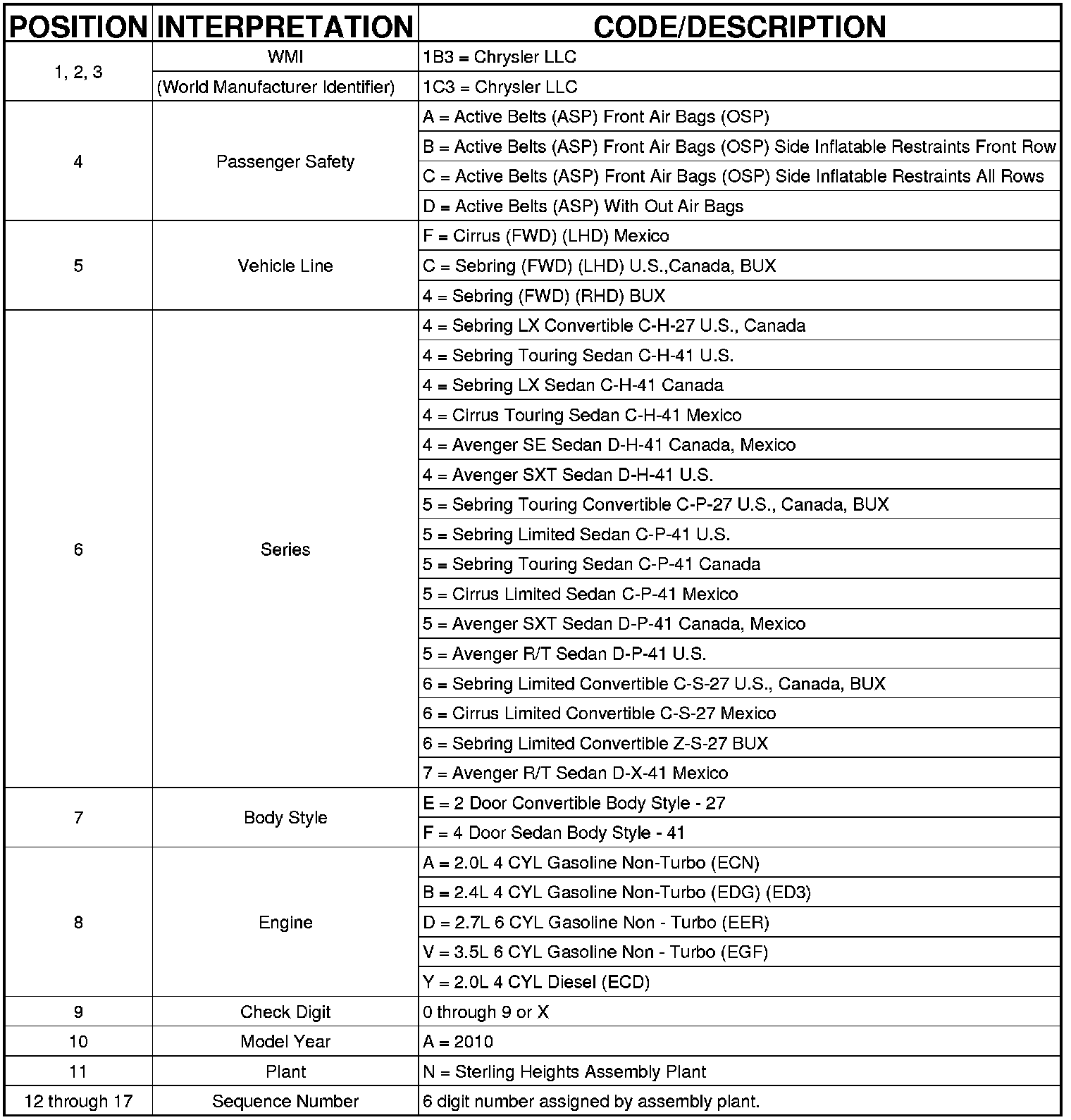 VIN CODE BREAKDOWN CHART