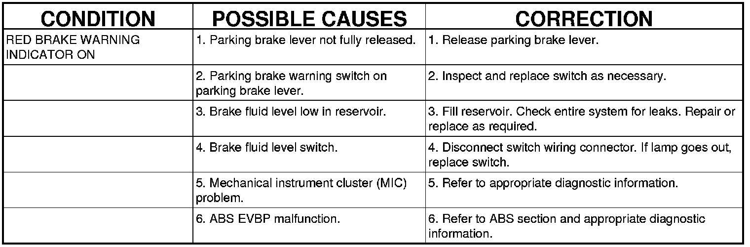NOTE: There are three diagnosis charts following that cover the RED BRAKE WARNING INDICATOR, BRAKE NOISE and OTHER BRAKE CONDITIONS.