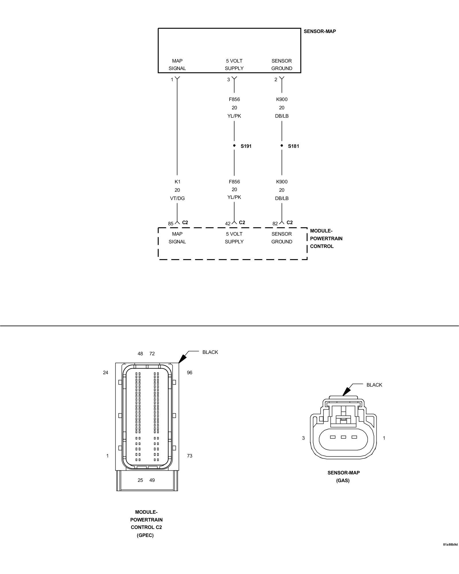 2. Using the wiring diagram/schematic as a guide, inspect the wiring and connectors between the MAP Sensor and the PCM.