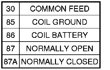 1. A relay in the de-energized position should have continuity between terminals 87A and 30, and no continuity between terminals 87 and 30. If OK, go to 2. If not OK, replace the faulty relay.