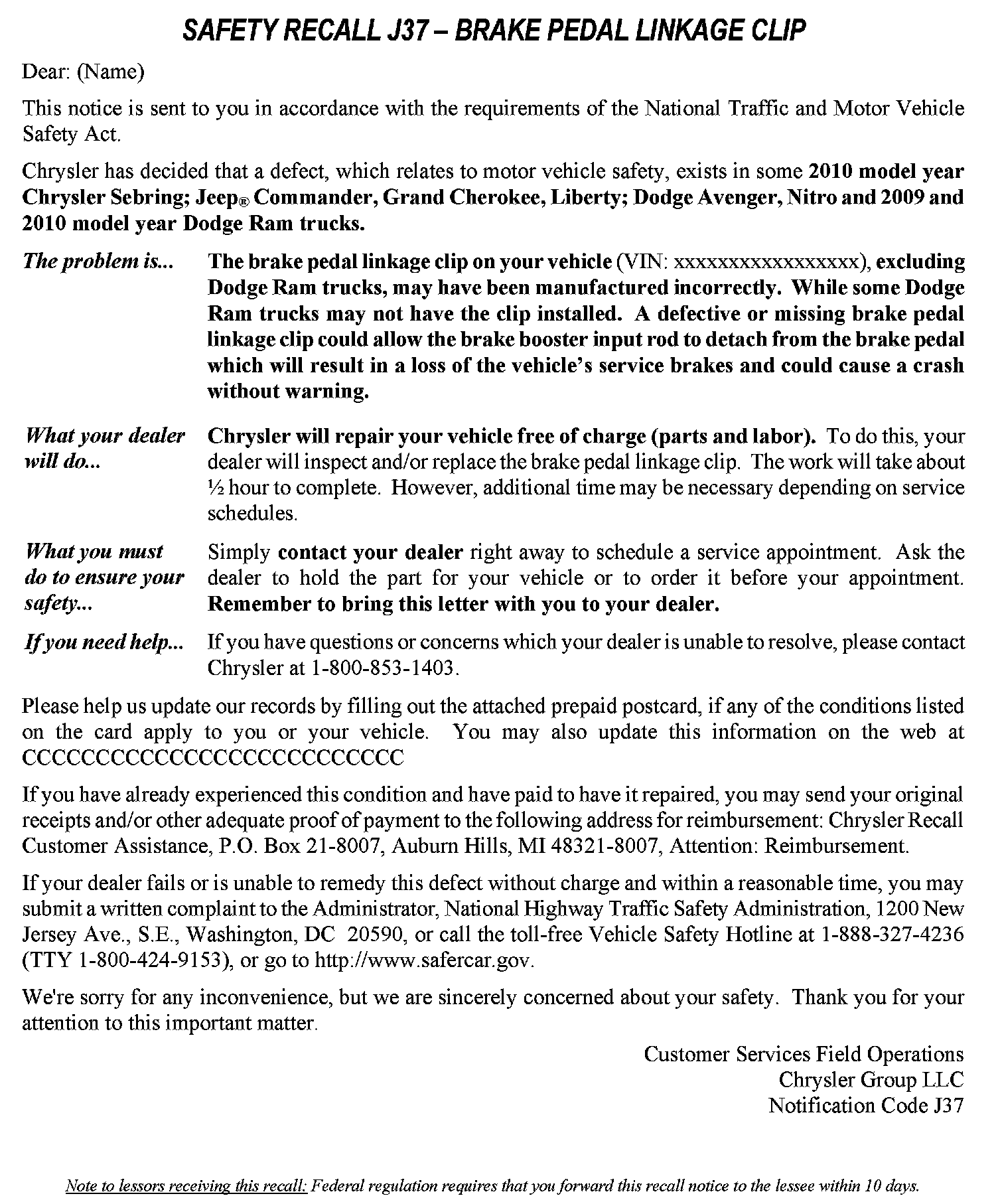 Recall - Brake Pedal Linkage Clip Missing/Defective
