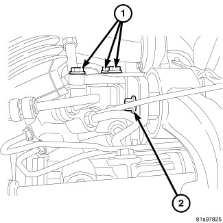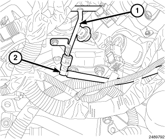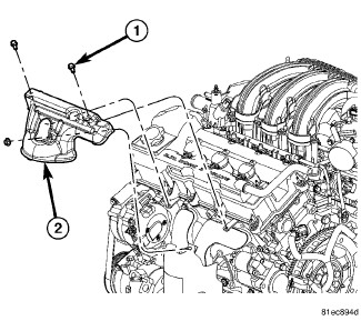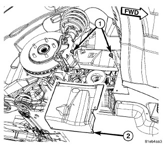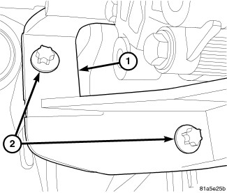 64. If equipped with the 62TE transmission, remove the bolt (1) and torque converter dust shield (2).