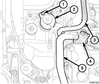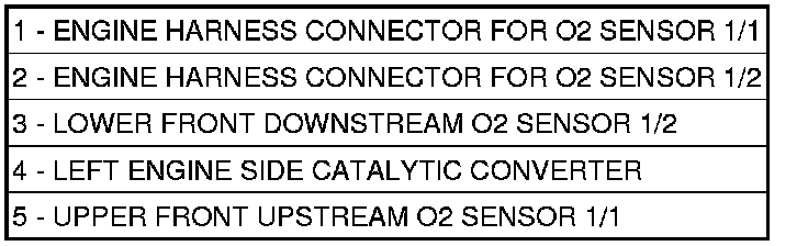 13. Disconnect the front upstream oxygen sensor (5) from the engine wiring harness connector (1).