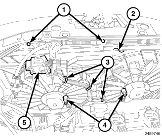 15. Disengage three wire harness retainers (3) and the wire harness connector (5) from the cooling fan module (2).