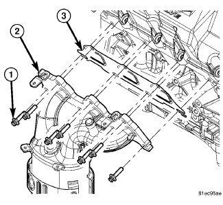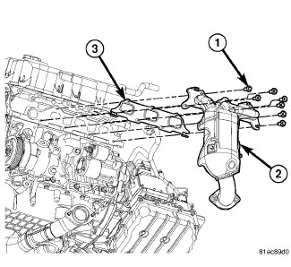 55. Remove the front exhaust maniverter attaching bolts (1), front maniverter (2) and gasket (3).