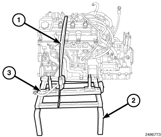 72. Adjust the vehicle height to allow the Powertrain Dolly 6135 (2) and Engine Support Cradle 6710A (3) with Cradle Posts 6848 and Cradle Post Adapter 6848 to be installed under the vehicle.