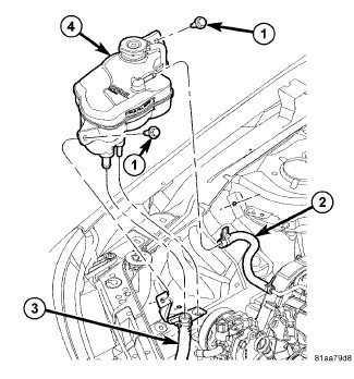 52. Remove two fasteners (1) and lift the coolant recovery container (4).