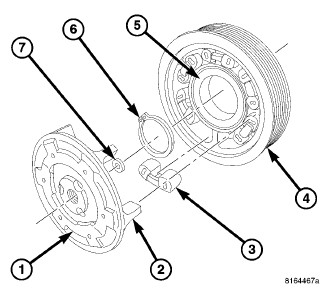 The A/C pulley has a bearing (5) which is retained to the nose of the A/C compressor with a snap ring (6). The drive hub and shim (7) are retained to the compressor shaft by use of left handed threads.