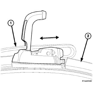 2. Slip the wiper arm (1) into the wiper blade (2) and pull away from vehicle until blade pivot is fully seated in the arm hook.