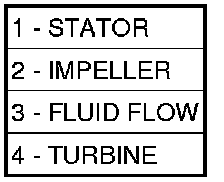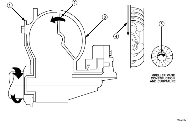 The impeller (3) is an integral part of the converter housing. The impeller consists of curved blades placed radially along the inside of the housing on the transmission side of the converter. As the converter housing is rotated by the engine (4,5), so is the impeller, because they are one and the same and are the driving member of the system.