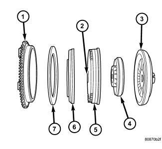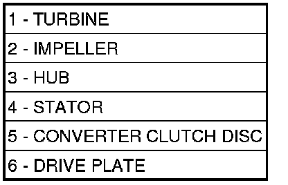 The torque converter is a hydraulic device that couples the engine crankshaft to the transmission. The torque converter consists of an outer shell with an internal turbine (1), a stator (4), an over-running clutch, an impeller (2) and an electronically applied converter clutch (5). The converter clutch provides reduced engine speed and greater fuel economy when engaged. Clutch engagement also provides reduced transmission fluid temperatures. The converter clutch engages in third gear. The torque converter hub (3) drives the transmission oil (fluid) pump.