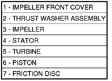 The stator assembly (1) is mounted on a stationary shaft which is an integral part of the oil pump. The stator is located between the impeller (2) and turbine (4) within the torque converter case. The stator contains an over-running clutch, which allows the stator to rotate only in a clockwise direction. When the stator is locked against the over-running clutch, the torque multiplication feature of the torque converter is operational.