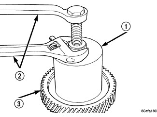 53. Using Gear Puller L-4407A (1) and Thrust Button 6055 (3) remove output shaft transfer gear (2) and select shim.