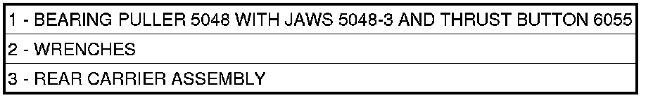 57. Remove rear carrier assembly (3) bearing cone using bearing puller 5048 with Jaws 5048-3 and thrust button 6055.