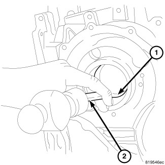 66. Using a hammer and suitable drift (2), drive out inner output bearing cup (1).