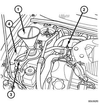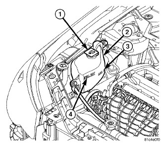NOTE: If the engine cooling system overheats and pushes coolant into the overflow chamber of the pressure container, this coolant will be drawn back into the cooling system ONLY IF THE PRESSURE CAP IS LEFT ON THE PRESSURE CONTAINER. Removing the pressure cap breaks the vacuum path between the two chambers of the pressure container and the coolant will not return to the cooling system. The engine cooling system will push any remaining air into the pressure container within about one half hour of normal driving. As a result, a drop in coolant level in the pressure container may occur.