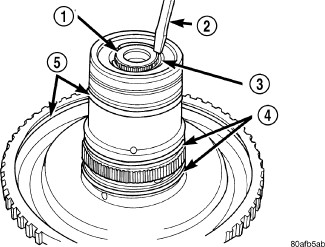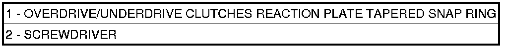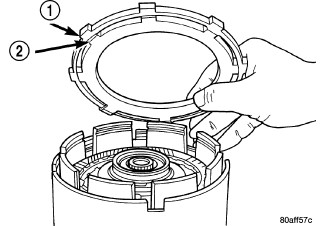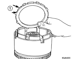 17. Place the OD/UD clutch reaction plate (1)and snap ring into position. The OD/UD clutches reaction plate has a step on both sides. Install the OD/UD clutches reaction plate tapered step side up.