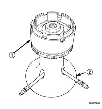 21. Install input clutch assembly (1) to the Input Clutch Pressure Fixture 8391 (2).
