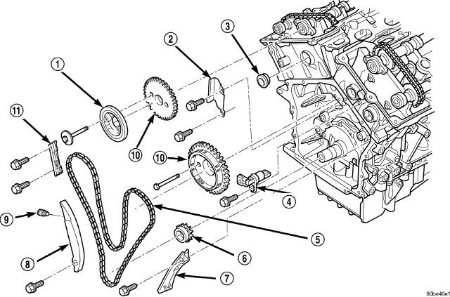 11. Remove left side camshaft sprocket attaching bolts and remove sprocket.
