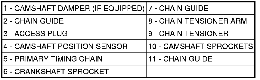 CAUTION: When the timing chain is removed and the cylinder heads are still installed, DO NOT rotate the camshafts or crankshaft without first locating the proper crankshaft position. Failure to do so will result in valve and/or piston damage.